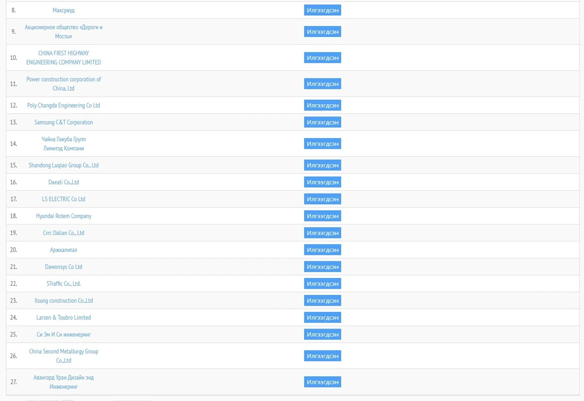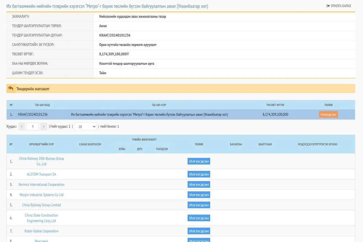 Тодруулбал, 2026 онд “Улаанбаатар метро төслийн барилга угсралтын гүйцэтгэгчийг шалгаруулах II шатны багц 1” тендерт оролцож буй агаад тендерийн ялагчийг 2026 оны 7 дугаар сарын 03-ны өдөр тодруулна.
