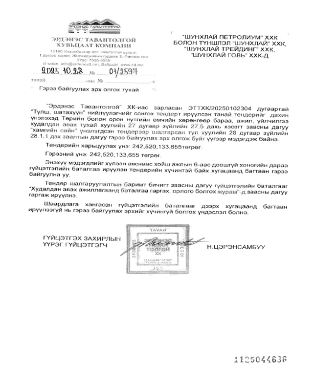 Улмаар 2025 оны 12-р сарын 2-ны өдөр “Шунхлай петролиум” ХХК-ийн түншлэлтэй төрийн өмчит “Эрдэнэс Тавантолгой” компанийн зүгээс “Түлш шатахуун худалдах, худалдан авах гэрээ” байгуулсан байна.
