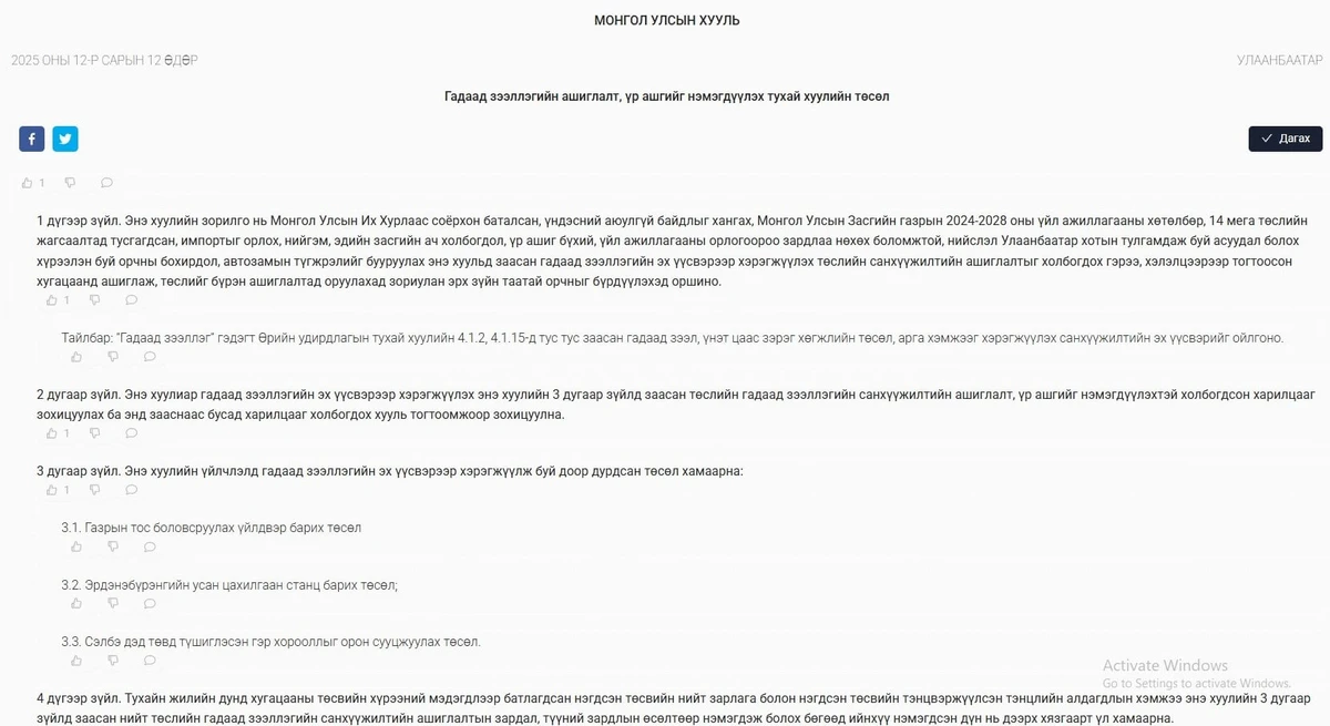 УИХ-ын ирэх Баасан гаригийн буюу 2026 оны 4-р сарын 24-ний чуулганаар Гадаад зээллэгийн ашиглалт, үр ашгийг нэмэгдүүлэх тухай нэг удаагийн хуулийн төслийн эцсийн хэлэлцүүлгийг хийнэ. УИХ дахь АН-ын бүлгээс “Энэ хуулийн цаана Монгол Улсыг хоёр төсөвтэй болгох үзэл санаа агуулагдаж байна. Хуулийн төсөлд багтсан 3 төслийн $3.5 тэрбумын зээлийг Монгол Улсын өрөнд тооцохгүй, тэр тусмаа орон нутгийн төсвийн хязгаарт хамааралгүй болгоё гэх нь зарчмын хувьд байж боломгүй асуудал юм. Цаашид судлах ёстой асуудал” гэж үзээд 2026 оны 4-р сарын 17-ны чуулганы хэлэлцүүлгийг үеэр ажлын нэг хоногийн завсарлага авсан юм.