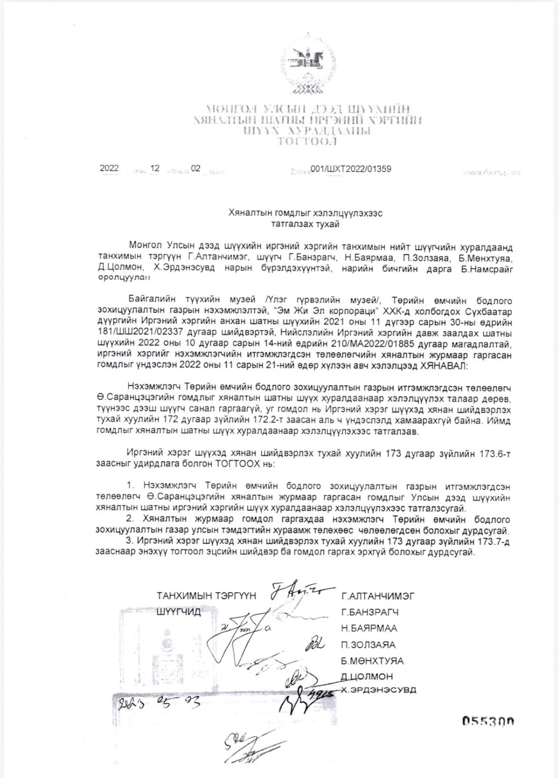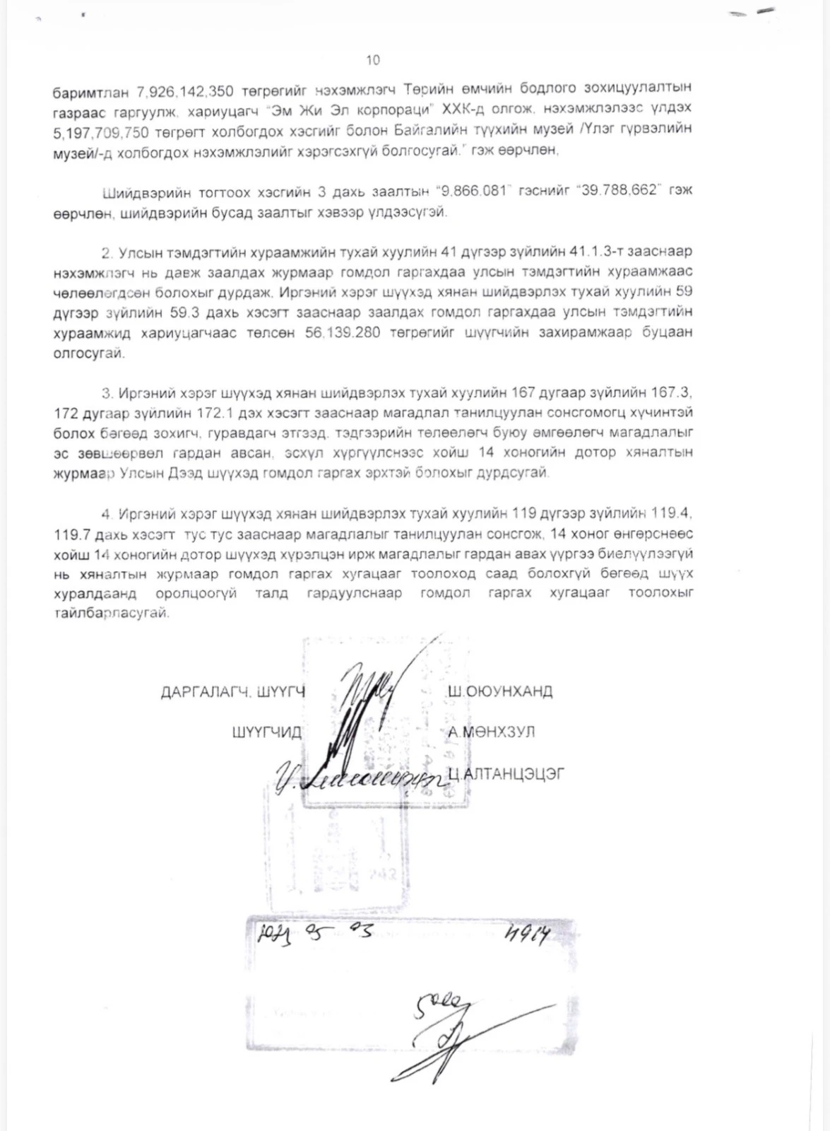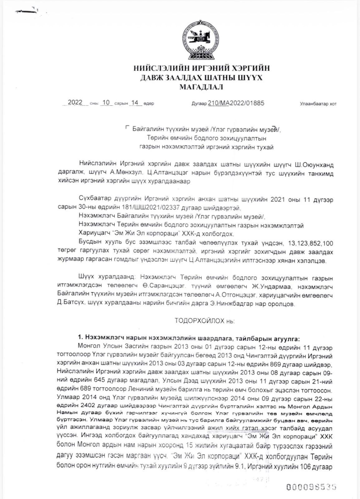 Шүүхийн шийдвэрийн дагуу “Эм жи эл корпораци” ХХК-ийн гэрээний зүйл болох барилгад хийж байсан засан сайжруулалт, засварын ажлыг зогсоож, уг барилгыг 2015 онд Үлэг гүрвэлийн төв музей, Төрийн өмчийн бодлого, зохицуулалтын газарт хүлээлгэн өгсөн тул 7,926,142,350 төгрөгийг олгохоор шийдвэрлэсэн байна.