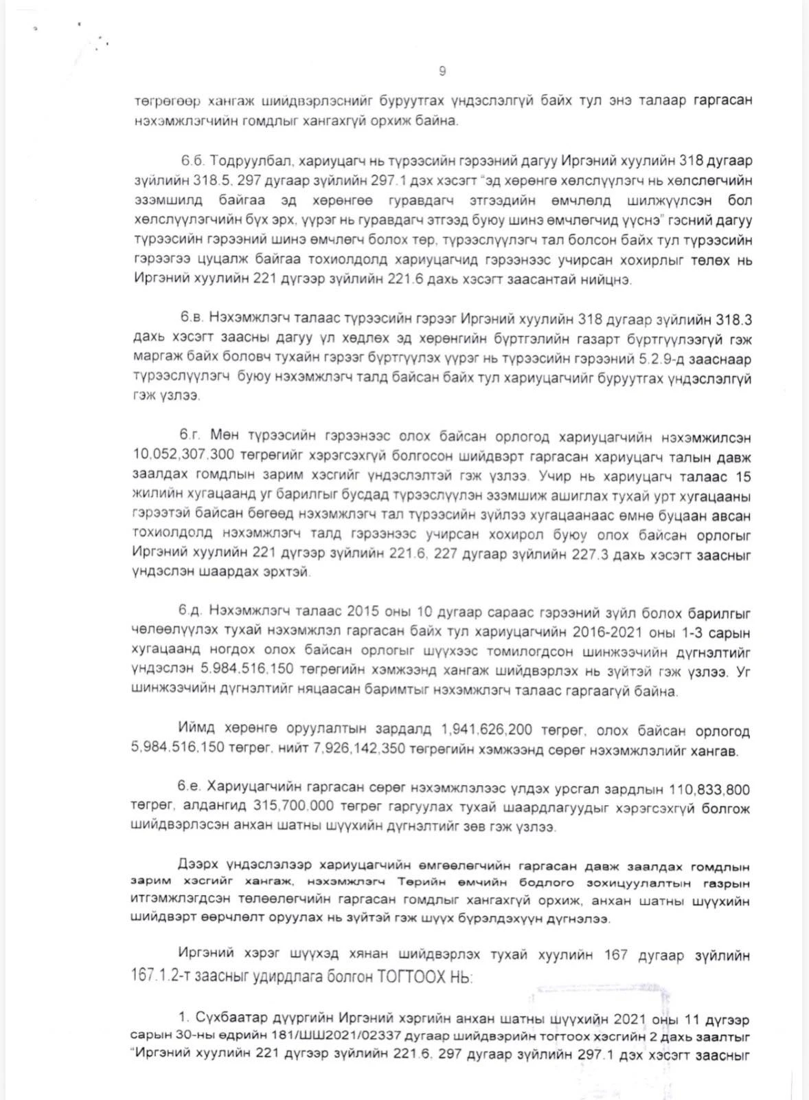 Иймд шүүхийн шийдвэрээр эцэслэн тогтоогдсон төрийн байгууллага, албан тушаалтны буруутай үйл ажиллагааны улмаас учирсан хохирол, төлбөр барагдуулалтыг хууль бусаар зарцуулсан, гүйлгээний мэдээллийг шилэн дансанд нөхөж байршуулсан гэдэг нь үндэслэлгүй, худал ташаа, бодит бус мэдээлэл болохыг мэдэгдэж байна.