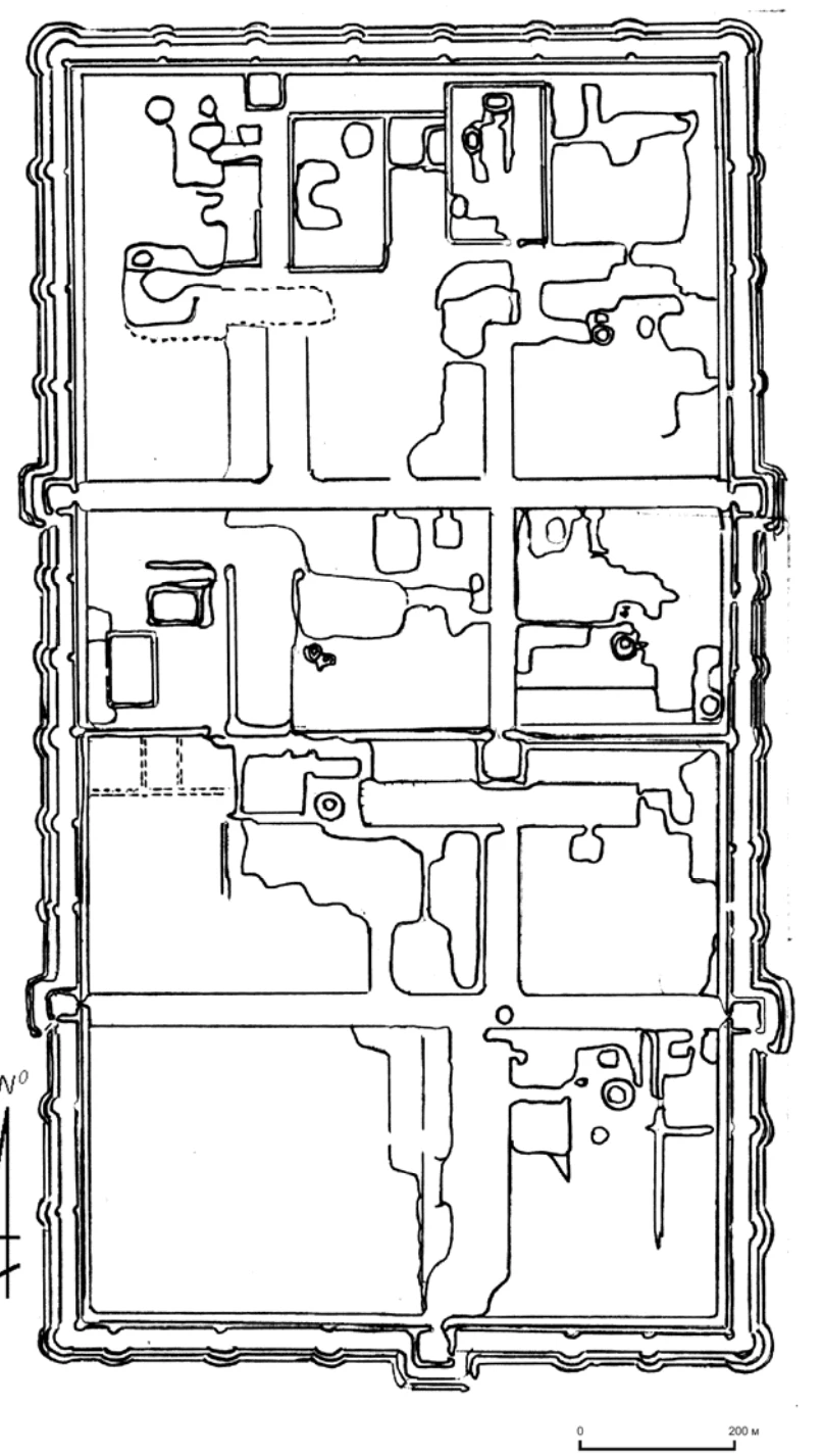 青陶勒盖城址在规划建设方面,先营建诸多具有小围墙的官府和宫殿,然后在府宫的周围建有诸多的小型房屋,最后经过统一的规划后修建城墙、城门以及城内的街道。 在平面分布上,青陶勒盖城址平面呈“日”字形。这与中国内蒙古的上京城和饶州城十分相似。 上京城位于赤峰市巴林左旗,由南、北相连的两城构成,平面呈“日”字形。北城为皇城,呈不规则六角形。南城为汉城,呈不规则方形。城墙全系夯土版筑,残存高度6-10米,墙基宽约12米。 饶州城位于林西县,平面呈长方形,由大、小相连的二城组成,西部城址比较小,系附城,东部城址为主城。整个城址东西全长1400米、南北宽700米。全城开设5座城门。 学者们认为,青陶勒盖古城的南区即外城,与上京的汉城一样,是供除契丹人以外的其他各族人居住的地方。而内、外城的分割及中墙城门营建瓮城,目的在于内城的居住者防范居住在外城的其他各族人的反叛。