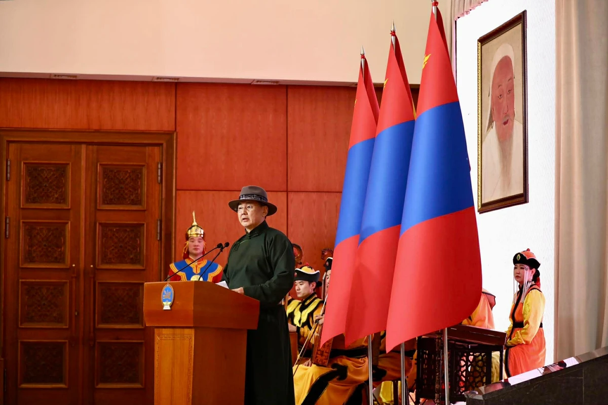 今年,我们以蒙古国国家最高奖——“成吉思汗”勋章,表彰索德夫苏伦·那仁格日勒院士在修订作为民主宪法实施基础的法律法规、培养法律专业人才、发展国家法律体系与法律科学方面作出的宝贵贡献,以及他多年来致力于研究圣主成吉思汗在世界范围内建立公正与和平的伟大事业所取得的卓越成就。他创作了数十部弘扬爱国主义民族精神的作品,并将其纳入科研与教学领域。我们高度肯定他的杰出贡献,特授予他这一崇高荣誉。