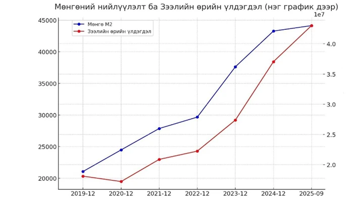 Өнгөрсөн 6 жилийн хугацаанд (2019 - 2025) мөнгөний нийлүүлэлт 21 их наяд төгрөгөөс 43 их наяд төгрөг болж, 2 дахин өссөн байдаг (график харна уу). Үүнийг дагаад банкуудын зээлийн тэлэлт явагдаж, арилжааны банкуудын зээл мөн 2 дахин өсөж 45 их наяд төгрөгт хүрсэн. Статистик мэдээгээр эдийн засгийн өсөлт жил бүр дунджаар 5-7% өсөлттэй байсан бол мөнгөний тоо хэмжээ жилд дунджаар 15-20% өсөж байжээ. Нэг үгээр зах зээлд үйлдвэрлэж нийлүүлсэн хэрэглээний барааны тоо хэмжээнээс мөнгөний тоо хэмжээ нь 3-4 дахин илүү их өсөж байсан байна. Төрөөс зээл, халамжаар зах зээлд цутгасан илүү мөнгө нь үйлдвэрлэсэн цөөн тооны барааг хэрэглэгчдийн уралдаж худалдан авах өрсөлдөөн хүчтэй өрнүүлж зохиомол агрегатан эрэлтийг үүсгэсэн гэсэн үг. Тиймээс Монголын инфляц нь ямагт эрэлтийн инфляц байдаг.