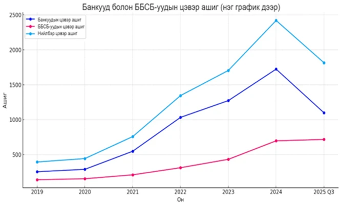 Мөнгө гаргаж буй төрөөс гадна арилжааны банкууд, ББСБ-ууд, ипотек орон сууцны барилгын компаниуд, тендер, концессоор хөрөнгө оруулалт, төсөл хэрэгжүүлэгчдэд хамгийн их ашигтай. Сүүлийн 5 жилийн хугацаанд төрийн мөнгөний нийлүүлэлт 45 их наяд төгрөг болж, хоёр дахин нэмэгдэх явцад зөвхөн мөнгө хүүлэгч санхүүгийн салбарын (банкууд, ББСБ) нийт цэвэр ашиг нь 470 тэрбумаас 2,5 их наяд буюу 5 дахин өссөн байдаг.