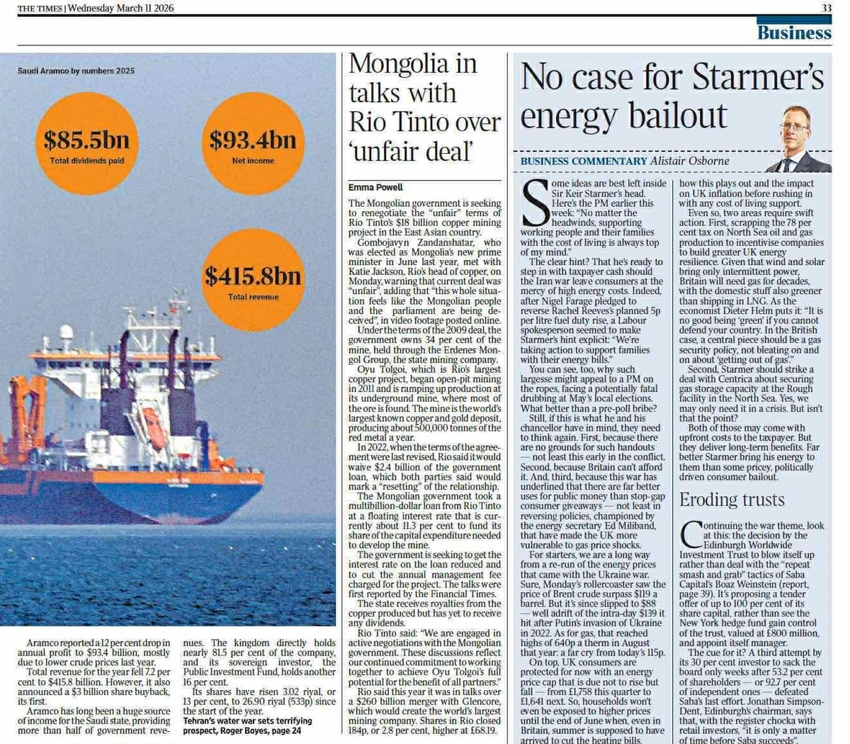 “The Times”: Монгол Улсын Засгийн газар Rio Tinto компанийн 18 тэрбум ам.долларын зэсийн уурхайн төслийн “шударга бус” нөхцөлийг дахин хэлэлцэхийг зорьж, маш тодорхой байр суурийг илэрхийлж байна.Энэ оны зургаадугаар сард Монгол Улсын шинэ Ерөнхий сайдаар сонгогдсон Гомбожавын Занданшатар даваа гарагт Rio Tinto-ийн зэсийн салбарын тэргүүн Кэти Жэксон-той уулзаж, одоогийн гэрээг “шударга бус” талаар байр сууриа илэрхийлээд таван утга бүхий шаардлага тавьжээ. Монголын Ерөнхий сайд Г.Занданшатар хэлэхдээ, цахим орчинд нийтлэгдсэн бичлэгтээ “энэ бүх нөхцөл байдал Монголын ард түмэн болон парламент хууртагдаж байгаа мэт санагдаж байна” гэж хэлсэн байна.