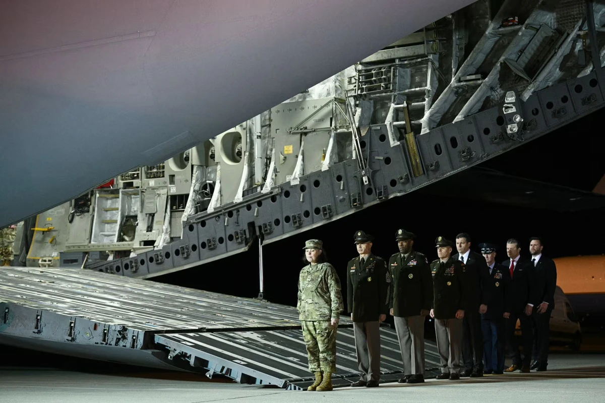 Батлан хамгаалах яамны нарийн бичгийн дарга Пит Хегсет (баруун гар талаас хоёр дахь) болон дэд ерөнхийлөгч Ж.Д. Вэнс (баруун гар талаас нэгд) нар цэргийн удирдагчдын хамт Делавэр мужийн Довер хотын Довер агаарын цэргийн баазад Кентакки мужийн Глендейл хотын 26 настай түрүүч Бенжамин Н. Пеннингтоны цогцос бүхий хайрцгийг тээвэрлэж яваа онгоцны дэргэд.