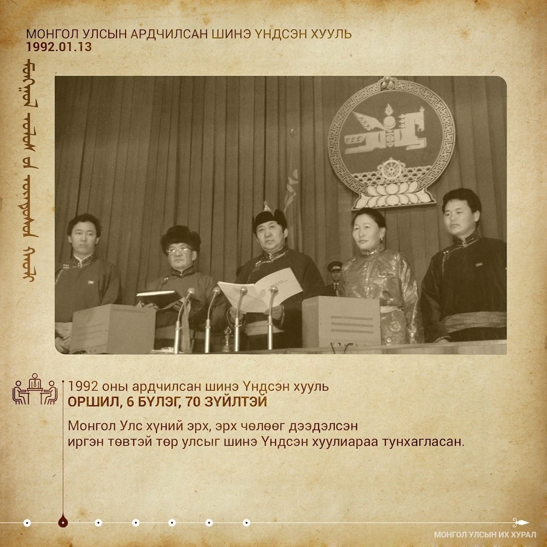 Монгол Улсын Үндсэн хууль 1992 онд батлагдсан бөгөөд 2000, 2019, 2022, 2023 онд нэмэлт, өөрчлөлт орсон юм.