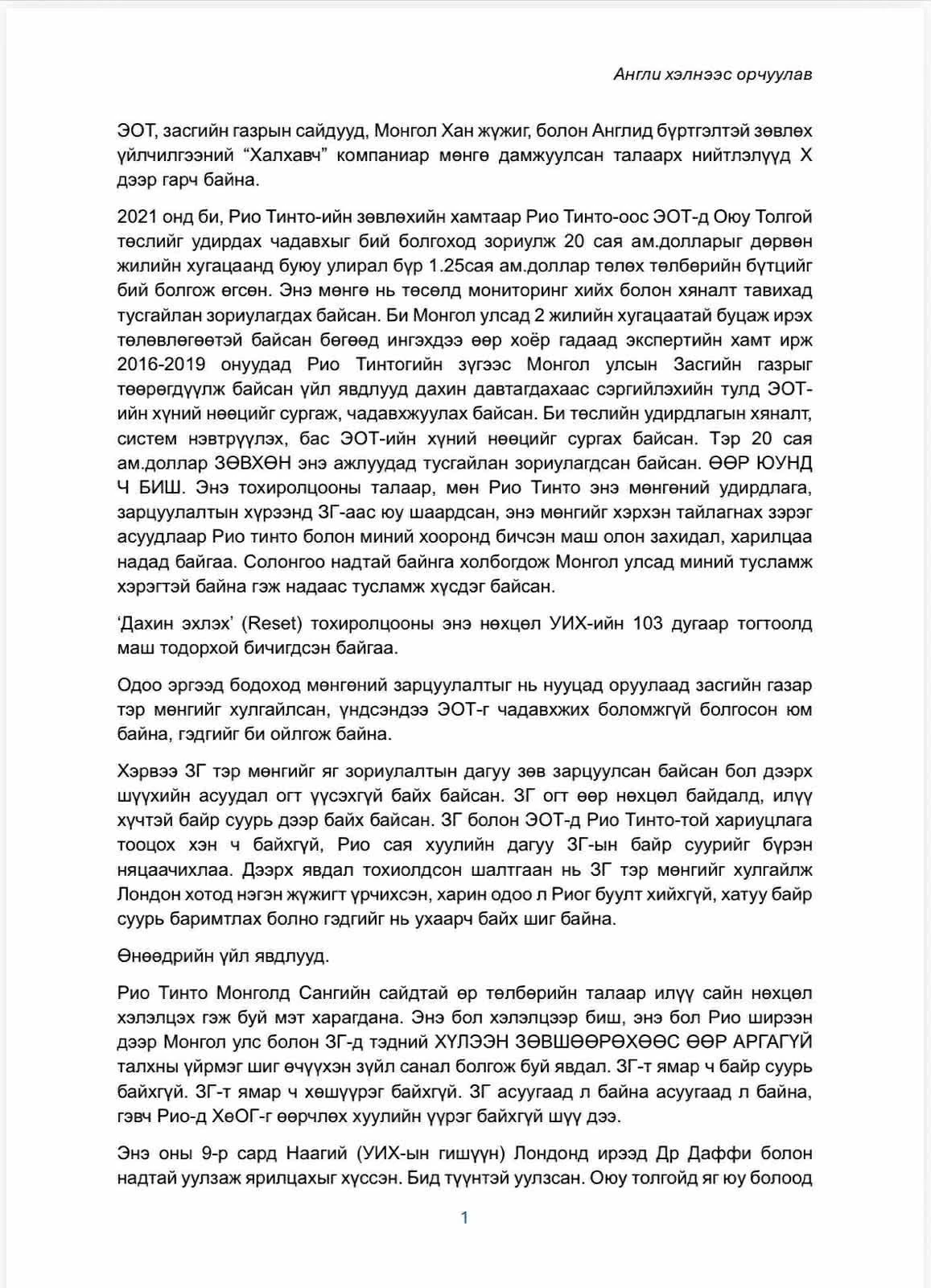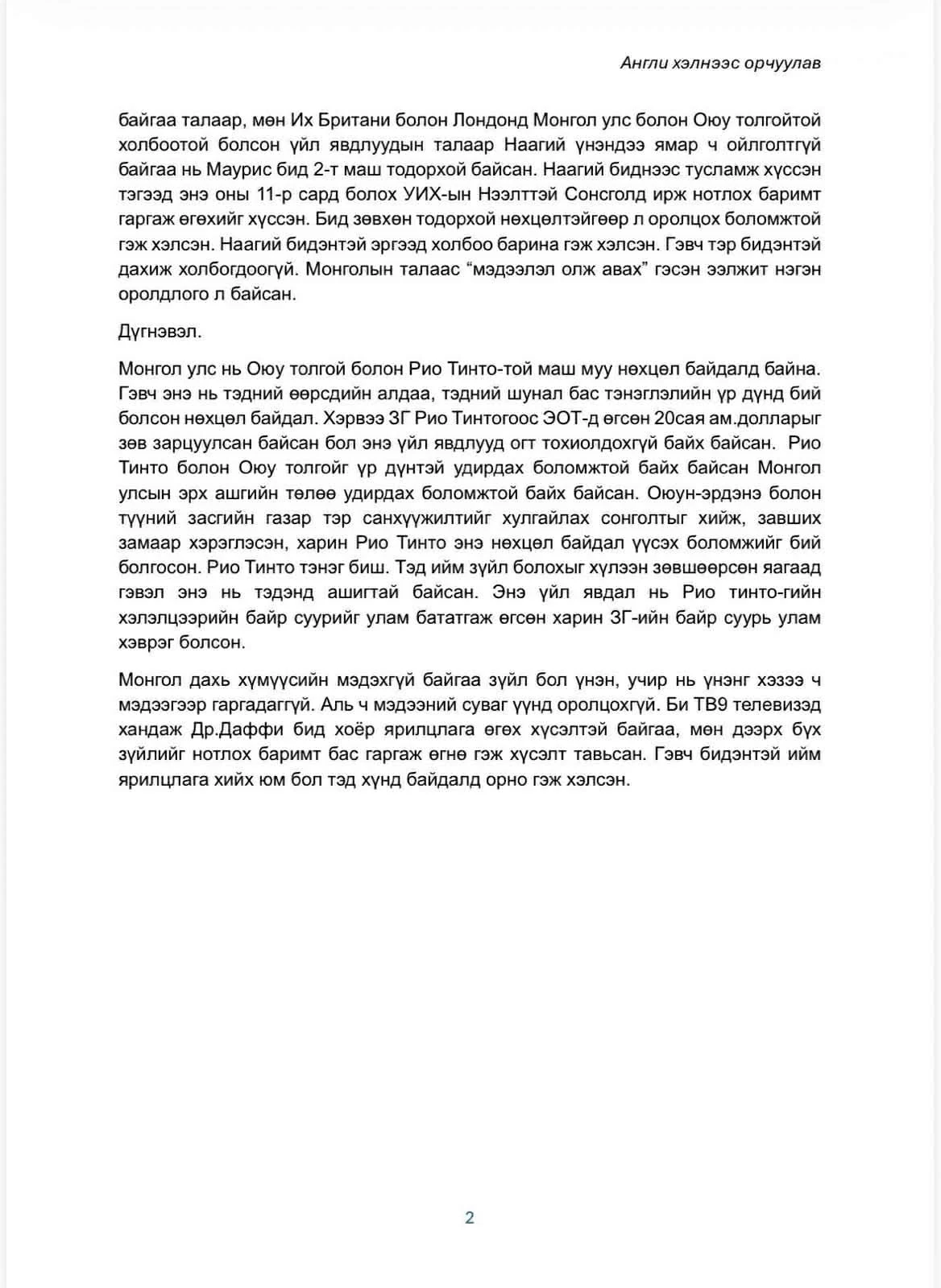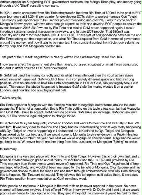 Мөн 2025 оны 9-р сарын Наагий /УИХ-ын гишүүн Батнайрамдал/ Лондонд ирээд Даффи бид хоёртой уулзсан. Тэр Оюутолгойд яг юу болоод байгаа талаар ямар ч ойлголтгүй байсан. 11-р сард болох УИХ-ын сонсголд биднийг оролцох санал тавьсан нь Монголын талаас мэдээлэл олж авах ээлжит оролдлого гэж санагдсан" тухай бичжээ.