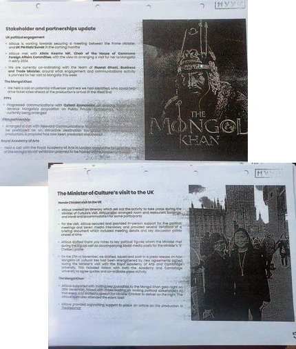 Сайд Б.Энхбаярын нийтэд мэдээлснээр Засгийн газрын албан ёсны шийдвэргүйгээр “Монгол хан” жүжгийн сурталчилгаанд зориулж “Атикус” гэх хоёр хүний компанид $1.76 сая, ИБУИНХУ-ын иргэн Ричард Боули, Маурис Даффи нарт $1.7 саяыг шилжүүлсэн нь баримттайгаар тогтоогдсон. Шилжүүлгийг гурван жилийн дараа Засгийн газрын хаалттай хуралдааны тэмдэглэлээр “нөхөж зөвшөөрсөн” болохыг ч мөн баримтаар ил болгосноор Л.Оюун-Эрдэнийн Засгийн газрын төгс хулгайн систем одоо л ойлгомжтой болж байна.