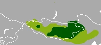 蒙原羚历史分布范围(浅绿色)与现在分布范围(深绿色)对比。图en.wikipedia.org