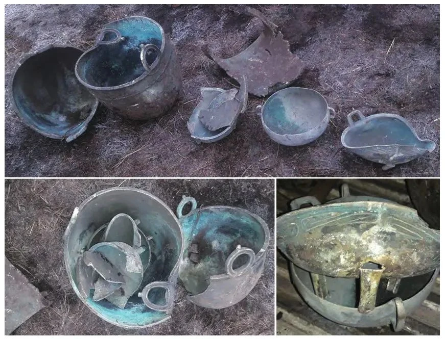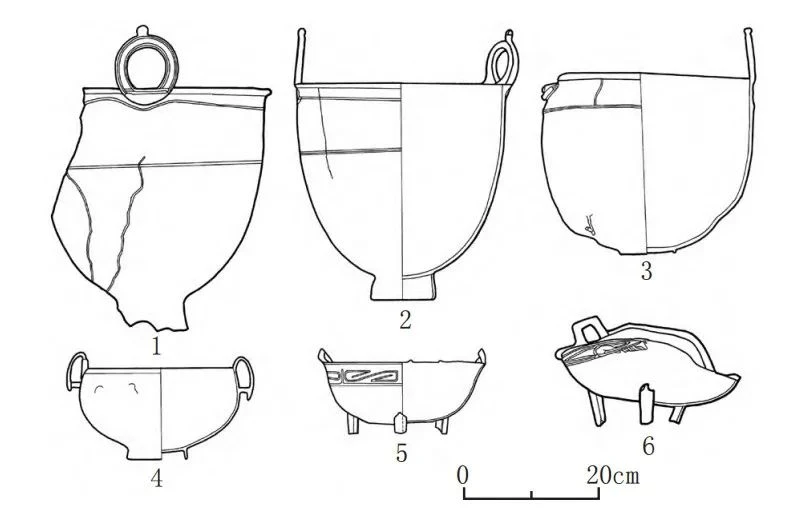 图二 布敦高勒铜器窖藏出土器物 1~ 3.深腹鍑 4.浅腹鍑 5、6.鼎