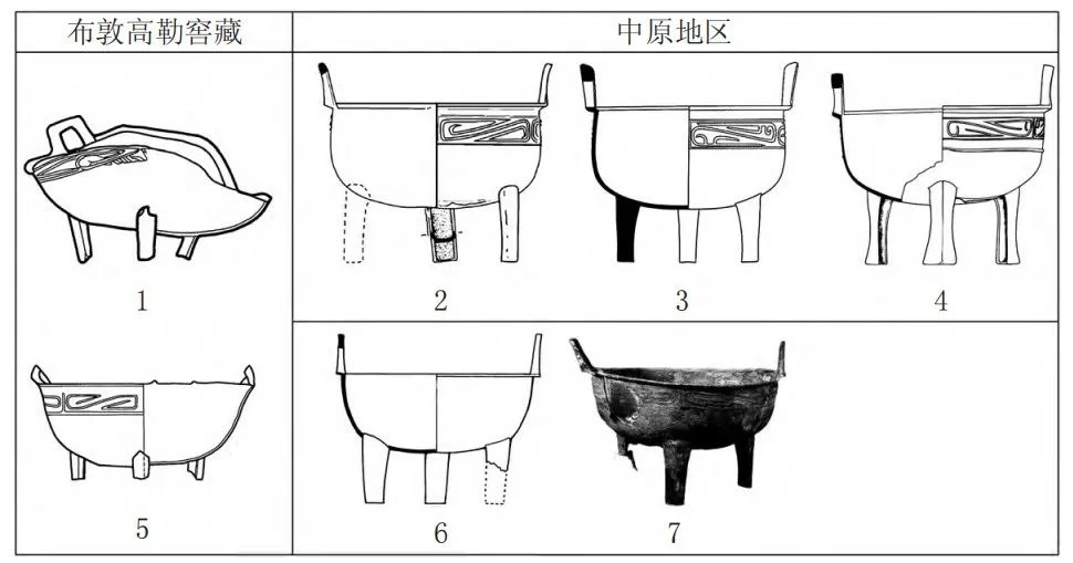 窖藏出土的铜鍑可分为两类,一类是深腹鍑,共3件。3件深腹鍑都有不同程度的残损,均为圜底、圈足、口沿两侧有环形立耳、耳上部有柱状凸起(图二[4],1~3)。另一类是浅腹鍑,仅1件。圜底、圈足、口沿两侧有半环形附耳(图二,4)。窖藏出土的2件鼎形制相似,均为立耳、侈口、弧壁、圜底,底部有三足,均残,口沿下施简化的S形龙纹(图二,5、6)。