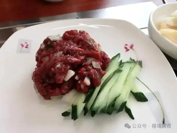 肉脍起源是否源自蒙古影响有一定争议性。其与西方的鞑靼牛肉做法类似,但肉脍会加入梨丝,口感清甜,个人非常喜欢这道菜,非常推荐大家尝一尝。