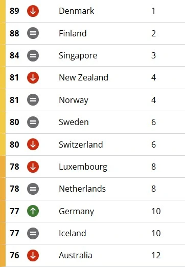 Улс орнуудын дийлэнх нь авлигыг үр дүнтэй хяналтдаа байлгаж чадахгүй хэвээр байгаа бөгөөд 180 улсаас гуравны хоёроос илүү нь буюу 122 улс 50-иас доош оноо авчээ. Дани улс индексийн хамгийн өндөр оноог (89) найм дахь жилдээ дараалан авч байгаа бол Финлянд (88) болон Сингапур (84) улсууд удаалж байна.