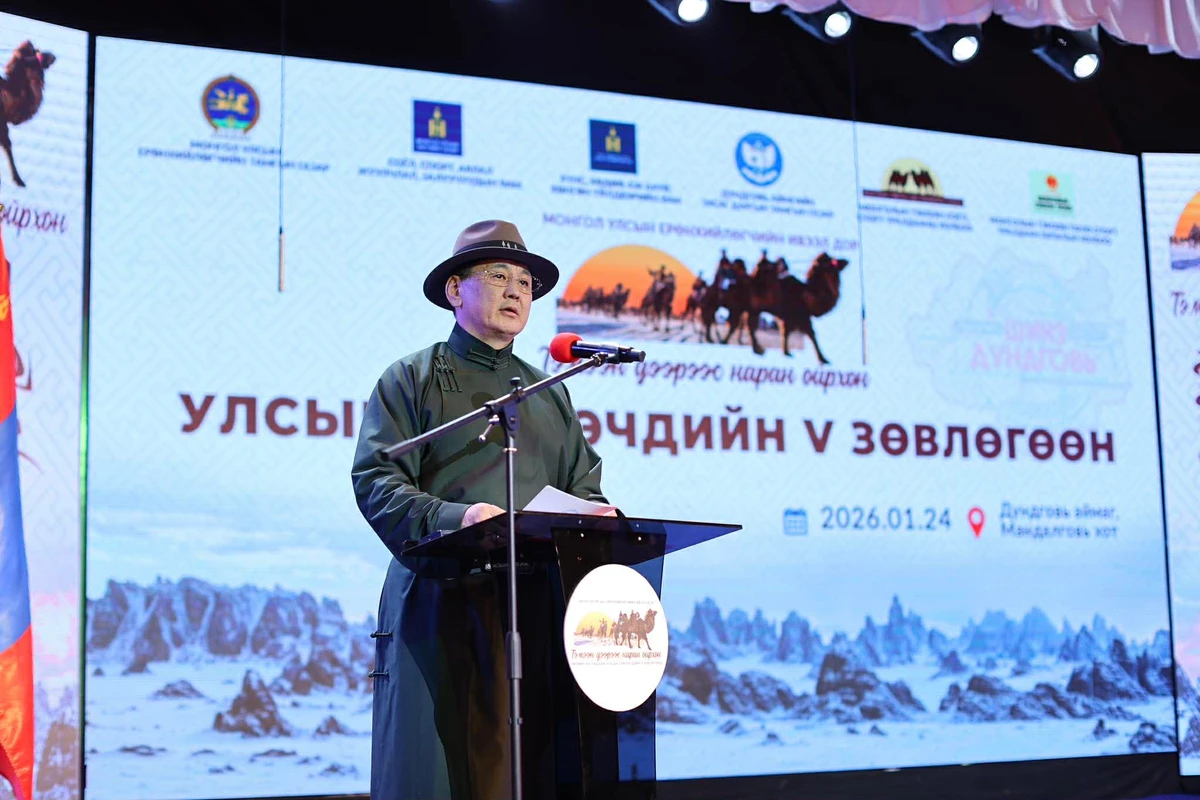 蒙古国总统乌·呼日勒苏和今日在中戈壁省首府曼达拉戈壁市开展工作期间,走访了当地居民和牧民,并于2026年1月24日出席了第五届全国骆驼牧民节开幕式。