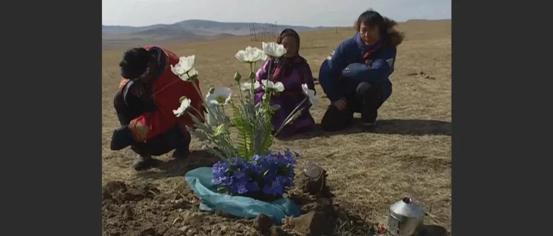 舅舅赛金把一条蓝色的经幡盖在了姐姐的坟头,外婆整理着祭品,等待祭祀仪式完成以后,把食物分给了在场的人吃。也撒向了土地,说也分给鸟儿吃一点~